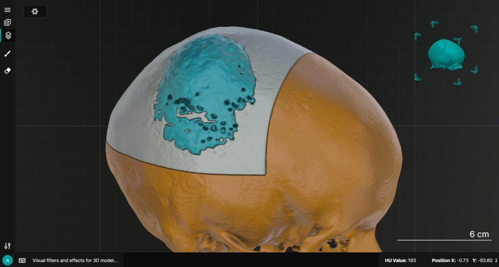 Automated cranial segmentation and defect analysis provide accurate anatomical measurements and mirrored reconstruction planning to support custom implant design and patient-matched instrumentation workflows.
